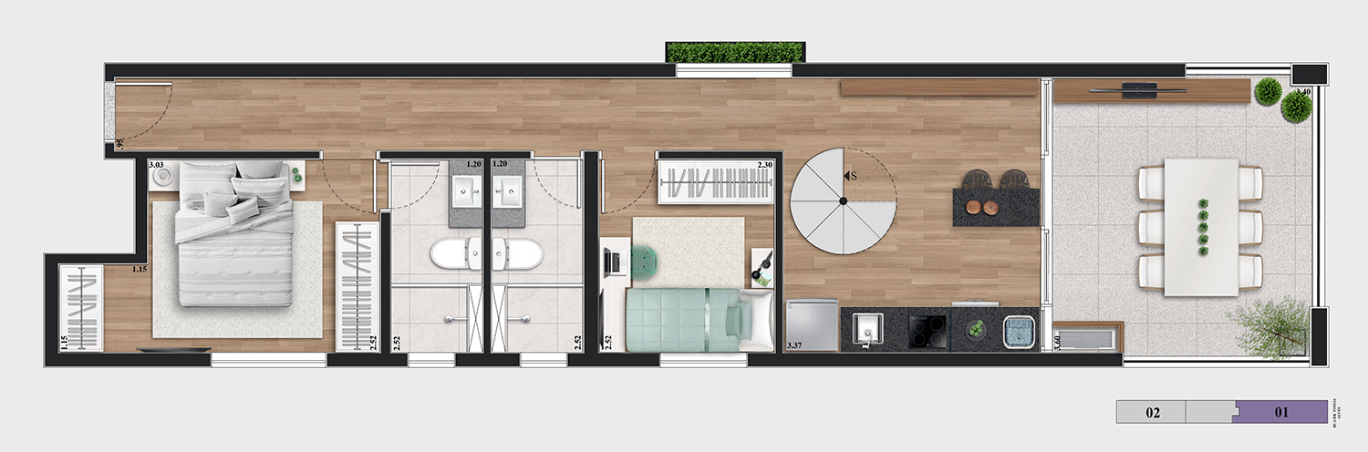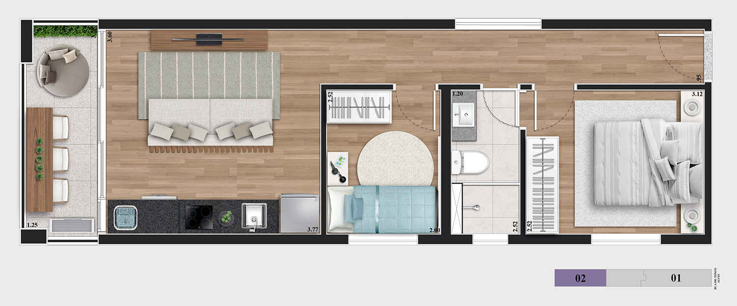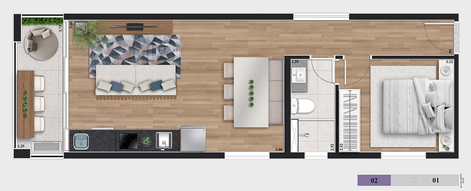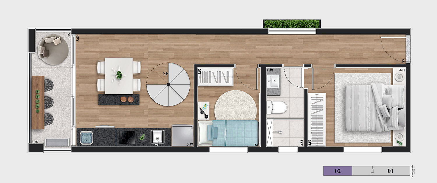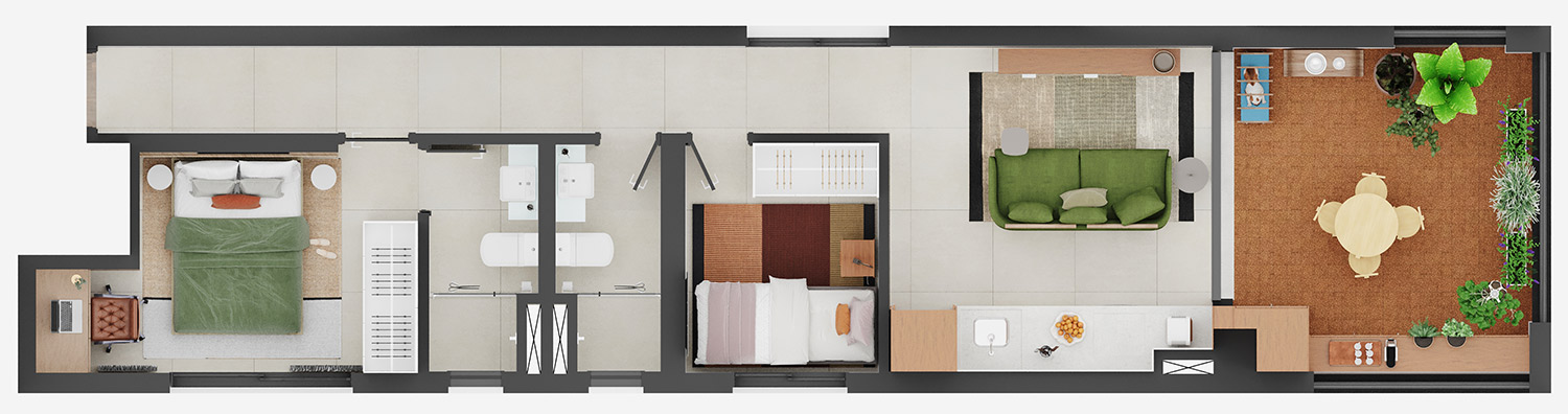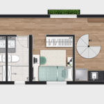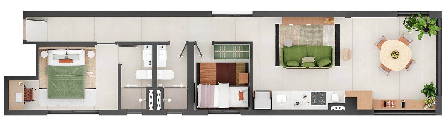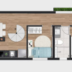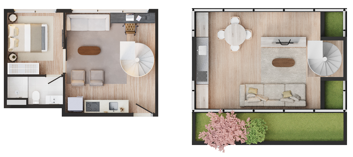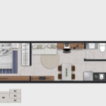 • Tipologias: Studios (25m², 32m², 33m² e 43m²), 1 dormitório (37m², 40m² e 46m²), 2 dormitórios (48m² e 64m²), “Casa suspensa” (118m²) e Duplex (95m² e 119m²)