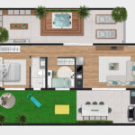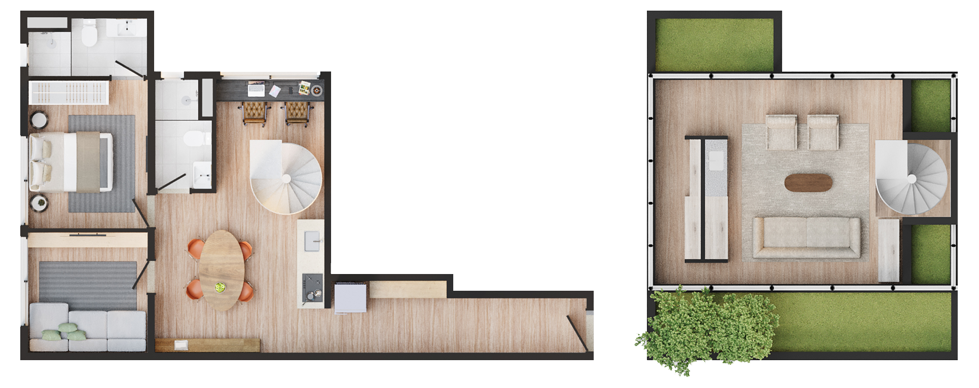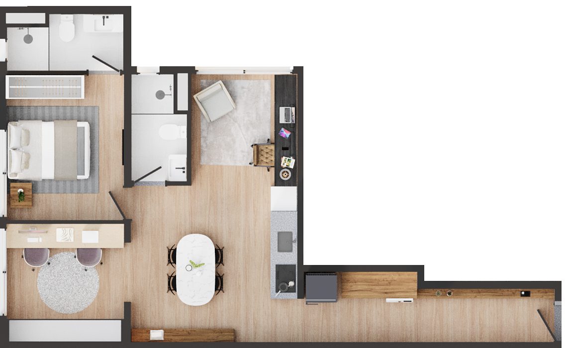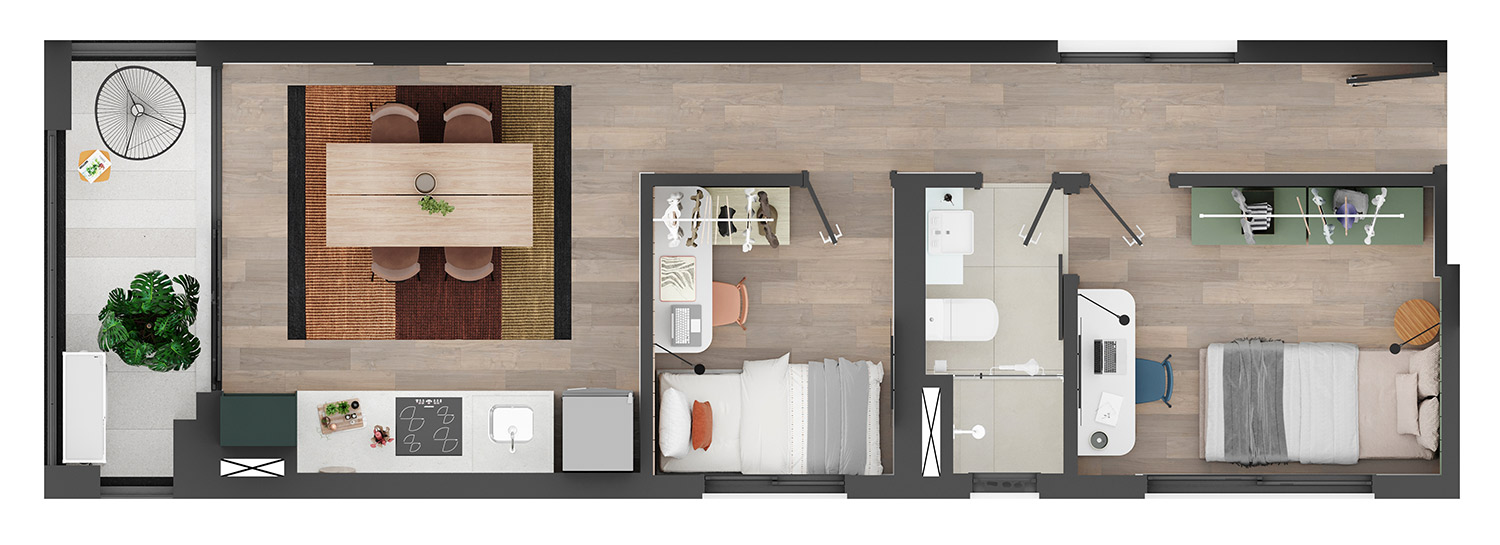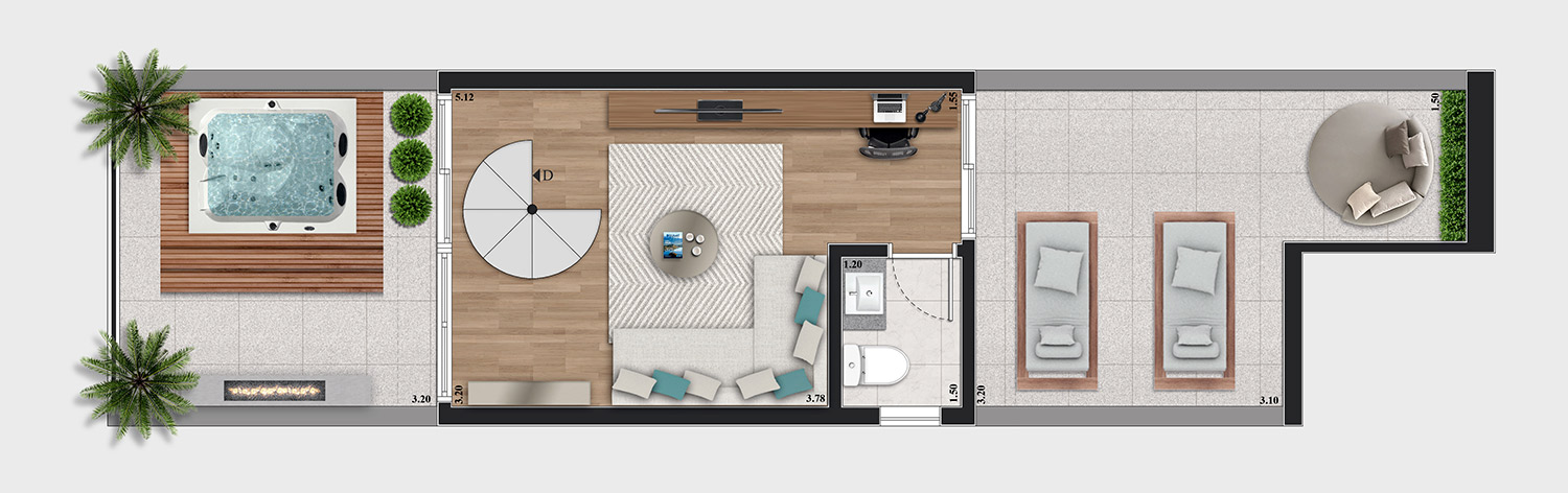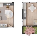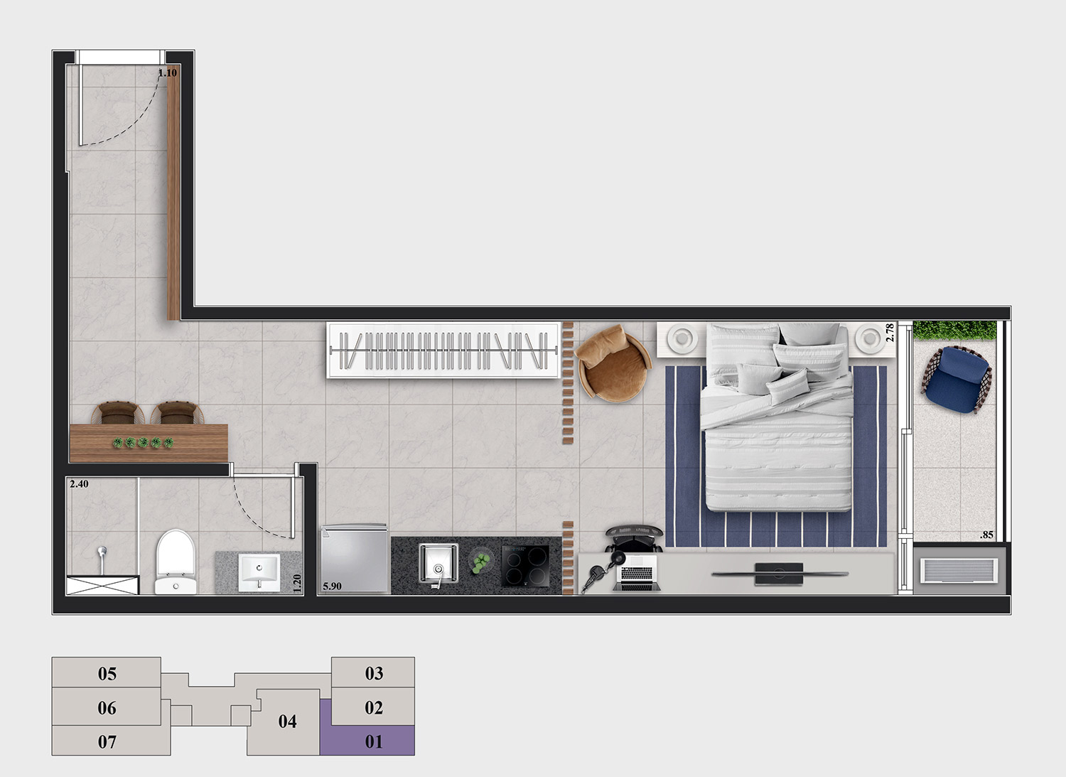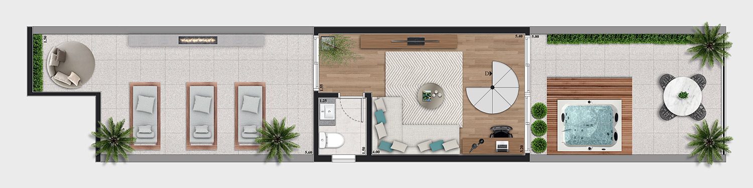 • Tipologias: Studios (25m², 32m², 33m² e 43m²), 1 dormitório (37m², 40m² e 46m²), 2 dormitórios (48m² e 64m²), “Casa suspensa” (118m²) e Duplex (95m² e 119m²)