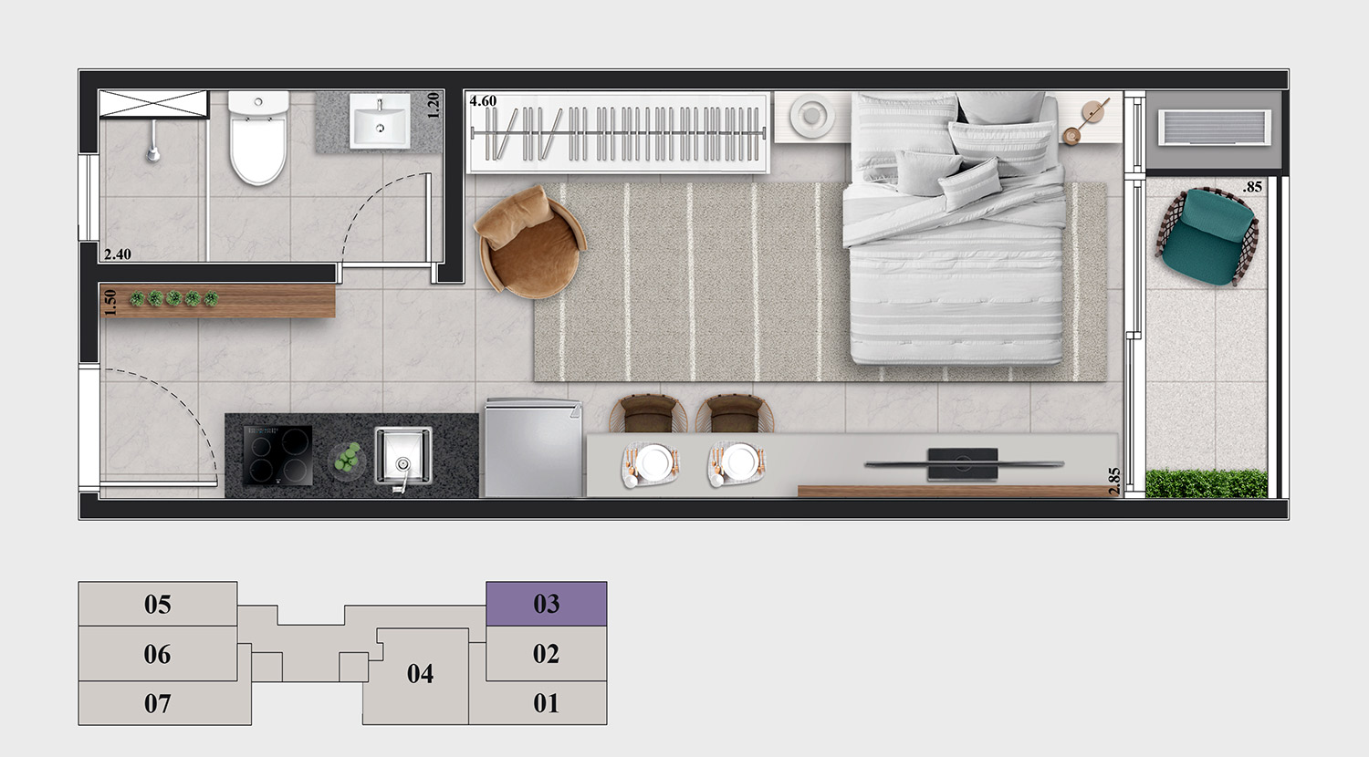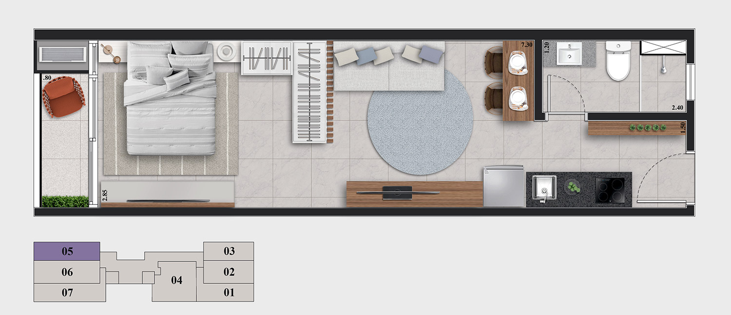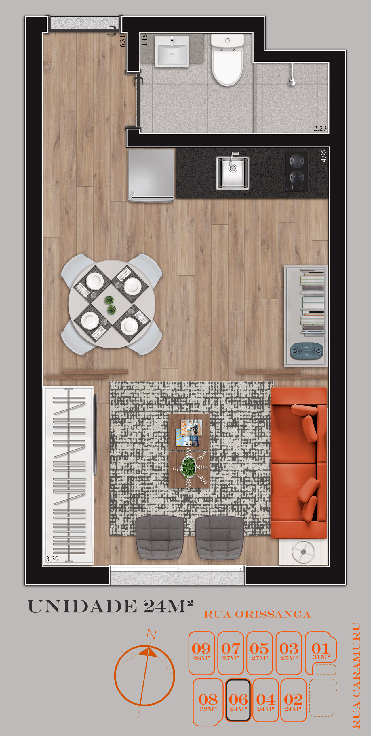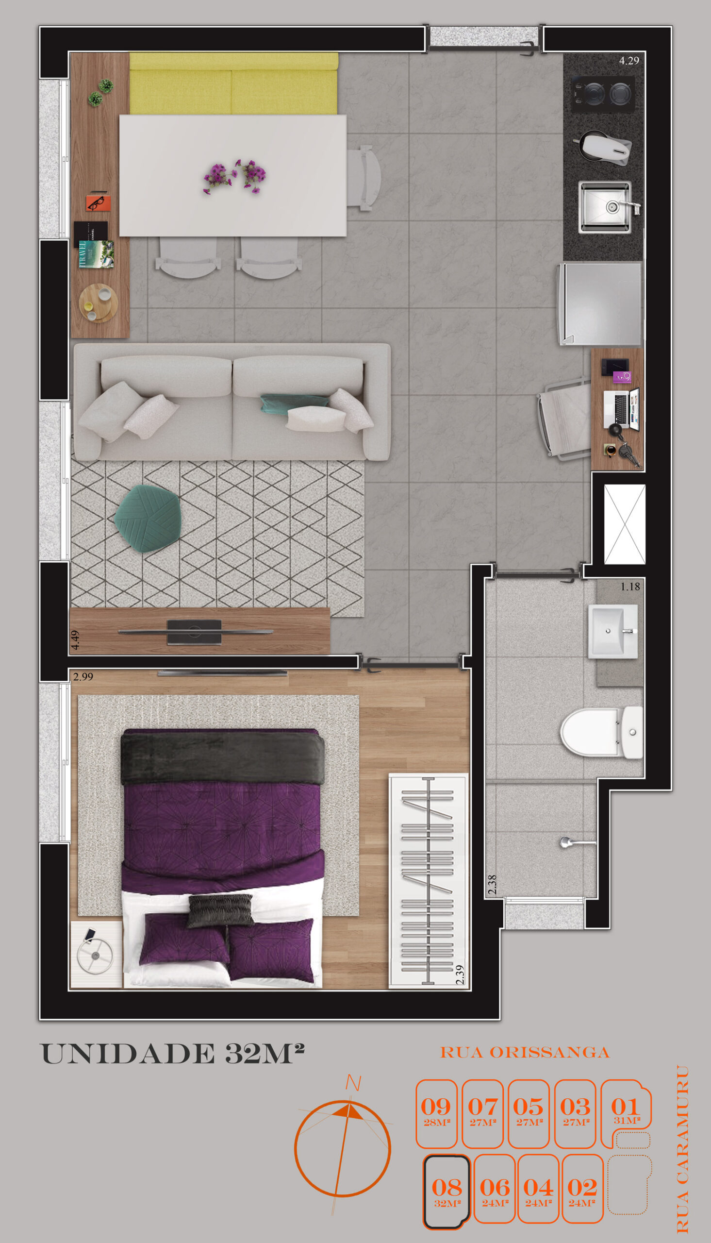 • Tipologias: Studios (24m², 27m² e 28m²), 1 dormitório (31m²) e 2 dormitórios (32m²)