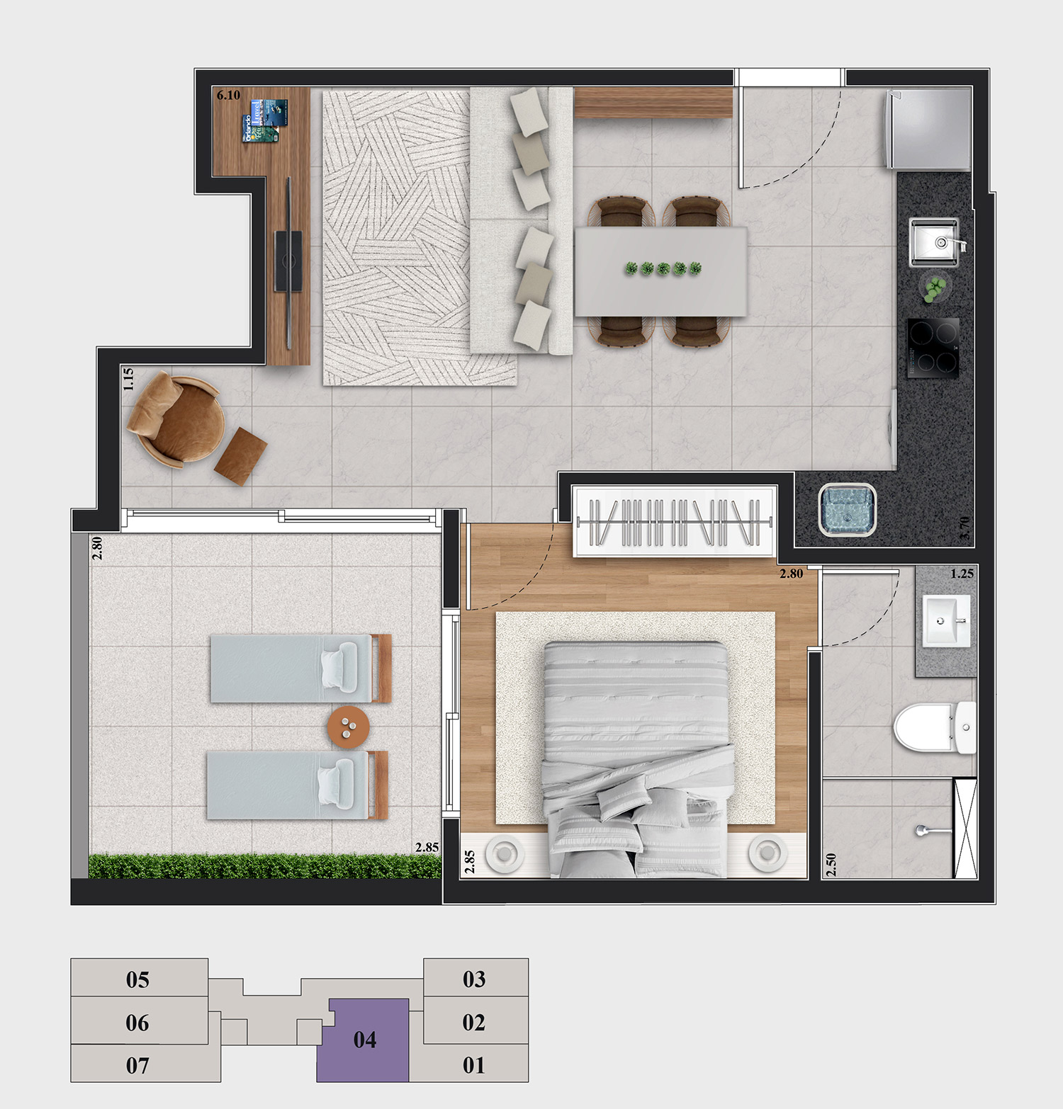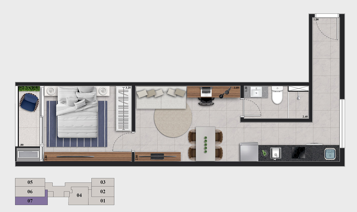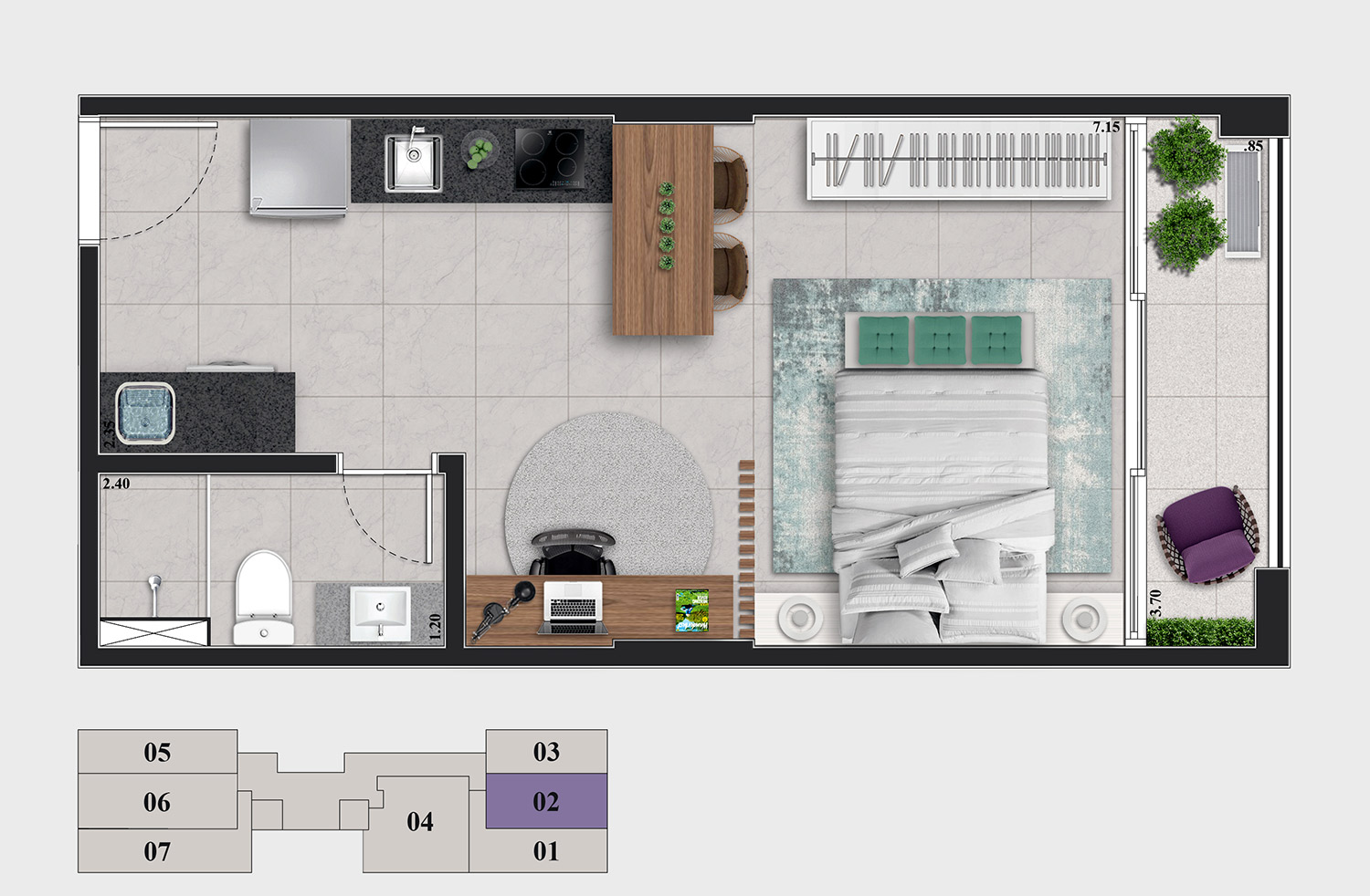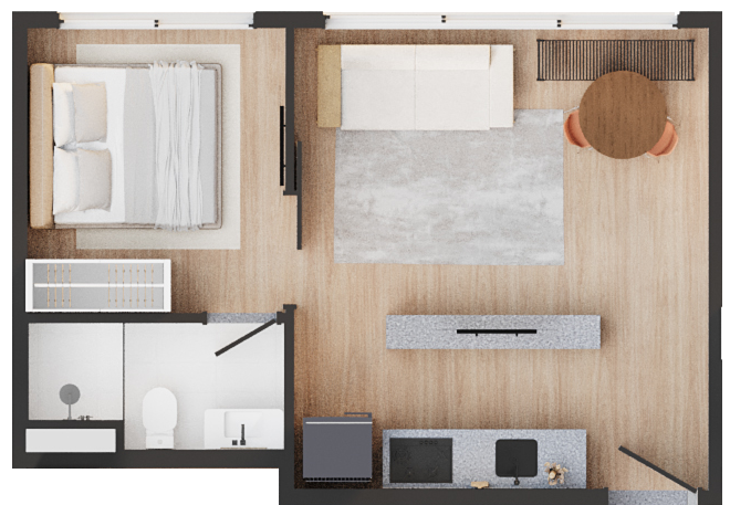 • Tipologias: Studios (24m², 27m² e 28m²), 1 dormitório (31m²) e 2 dormitórios (32m²)