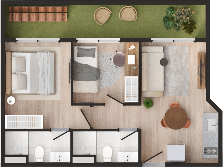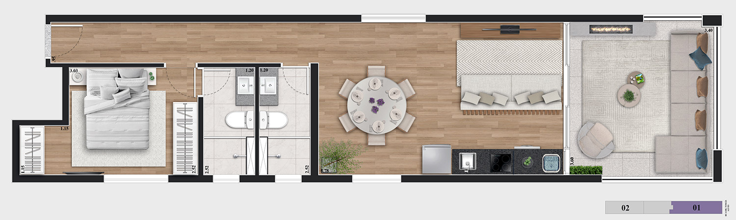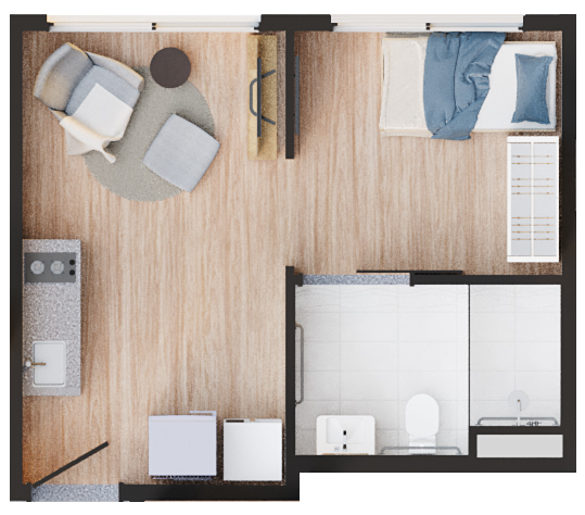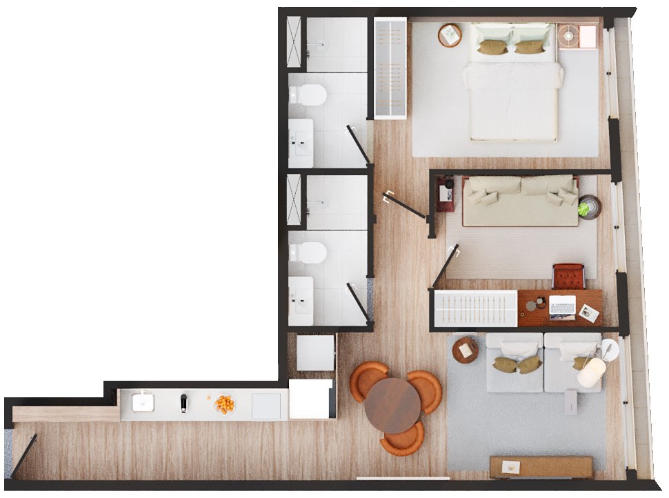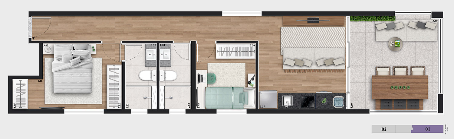 • Tipologias: 1 dormitório (30m², 32m² e 34m²) e 2 dormitórios (40m² e 43m²)